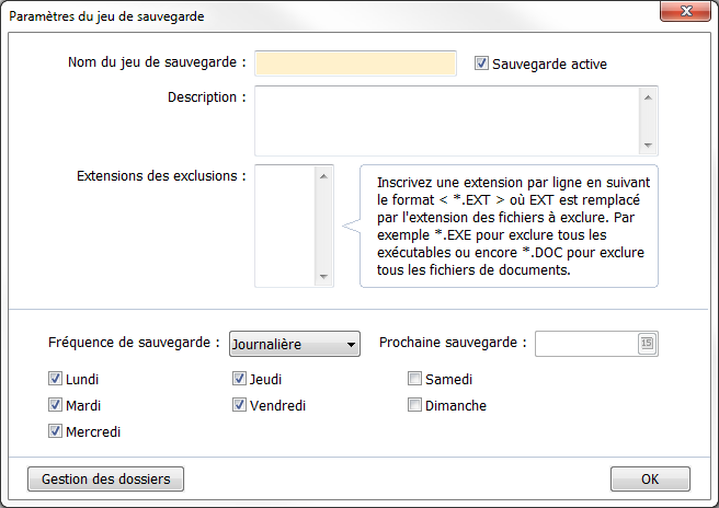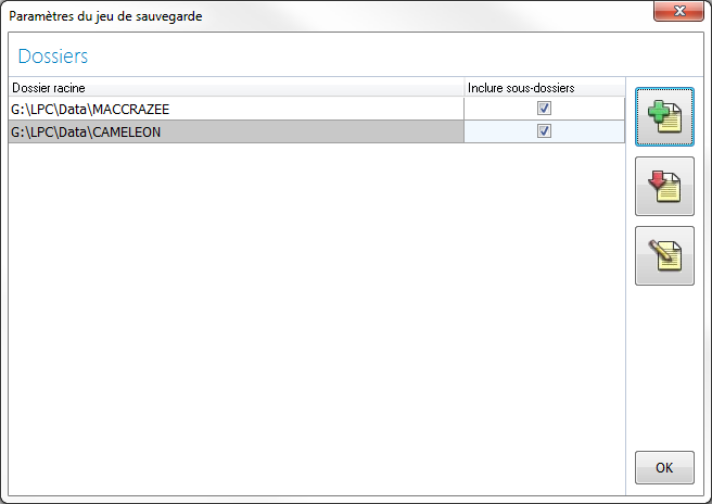 Pour chacun des jeux de sauvegardes créés, il est possible de configurer un nombre illimité de dossiers à inclure. Cliquer le bouton «Gestion des dossiers» pour accéder à l'écran permettant de programmer les dossiers à sauvegarder dans l'archive courante. L'écran suivant est alors présenté :