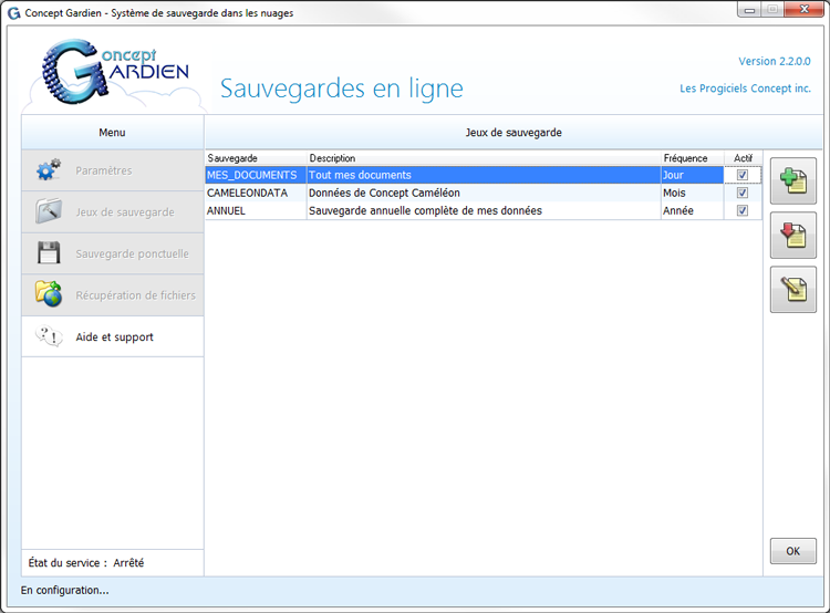 Concept Gardien effectue ses sauvegardes en se basant sur des jeux de sauvegarde. Chaque jeu de sauvegarde définit des règles ainsi que des emplacements de fichiers à inclure dans l'archive finale.
